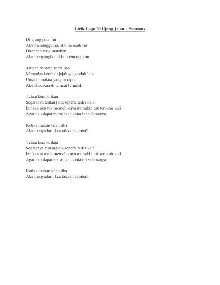 Di ujung jalan samson lirik dan chord Kisah Yang Tersimpan Begitu Indah Di Relung Hati. Grup band Samsons sendiri didirikan pada tahun 2003. SURYAMALANGCOM - Kutipan lirik lagu Tuhan Kembalikan Segalanya Tentang Dia merupakan bagian dari lagu berjudul Di Ujung Jalan yang dopopulerkan oleh Samsons.